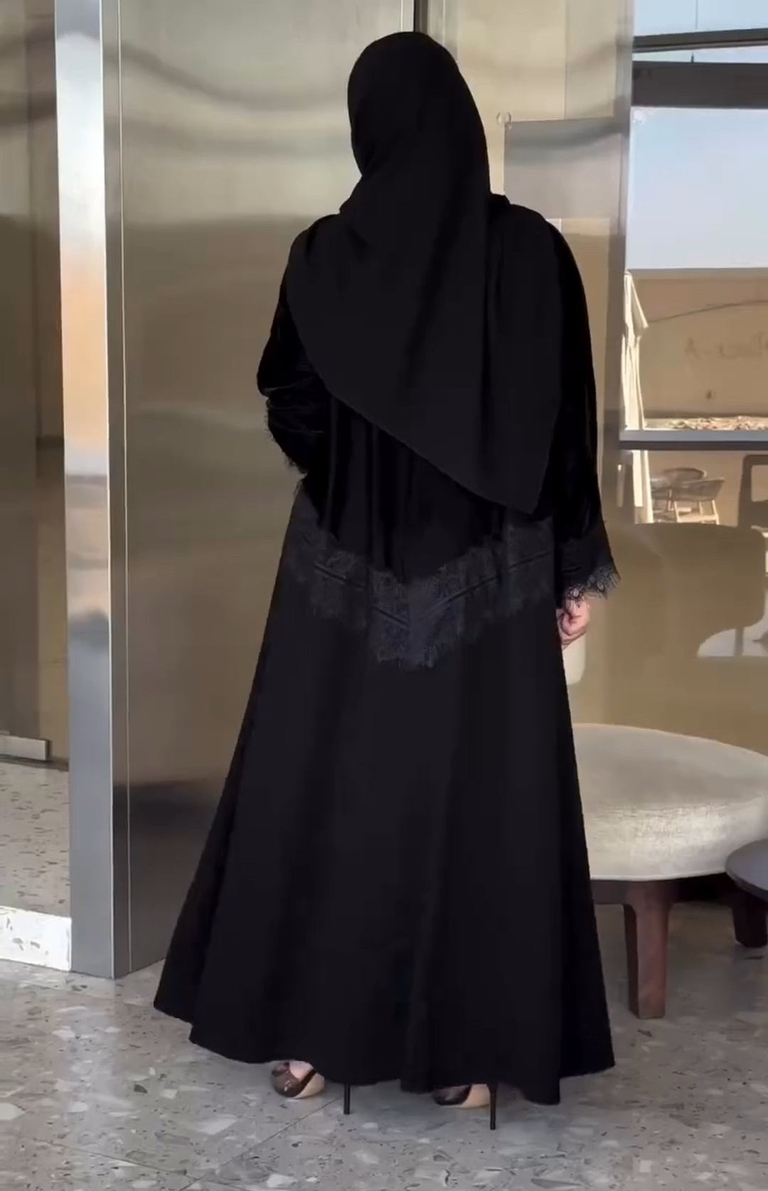 عباية ليان بتصميم فريد يجمع بين فخامة المخمل الملكي في الجزء العلوي ونعومة الكريب الانسيابي في الأسفل